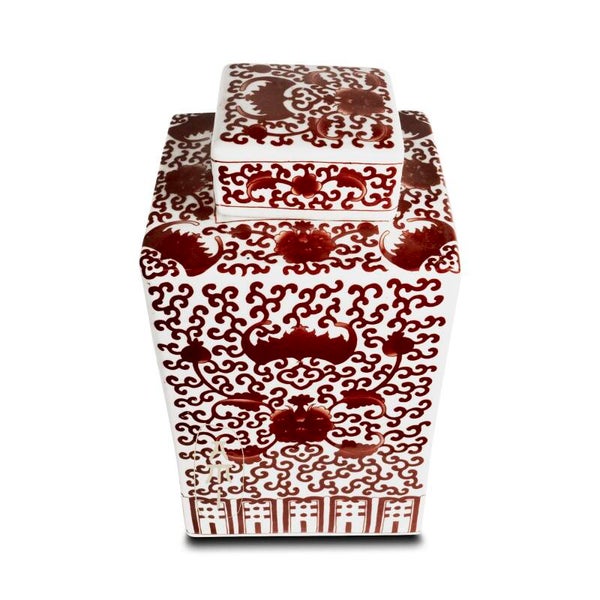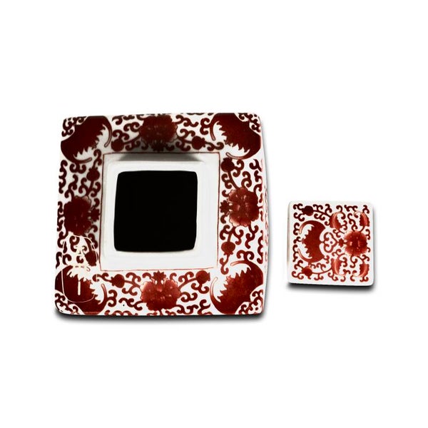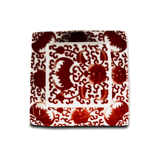 Deze grote vierkante pot is handgemaakt en gedecoreerd met een fijn diep koraalrood patroon.