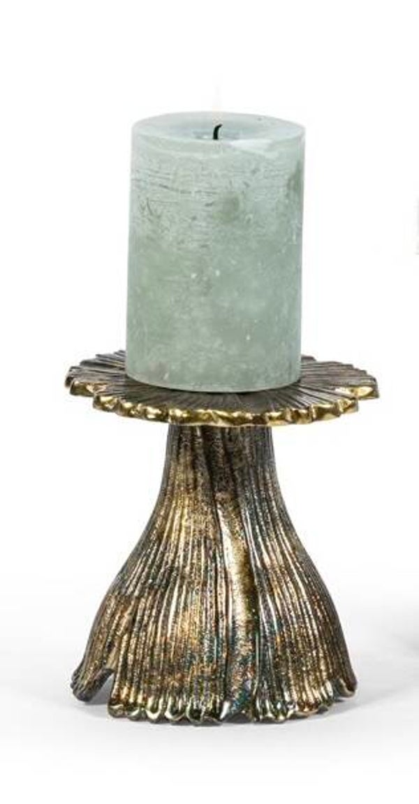 Deze kandelaars Antique brass met hun speelse organische vorm zijn een echte eyecather voor je interieur. Je zou er een waterlelie in kunnen zien. Ze hebben een plat deel in de vorm van een blad waar stompkaarsen op passen en ze staan op een voet in de vorm van een steel.