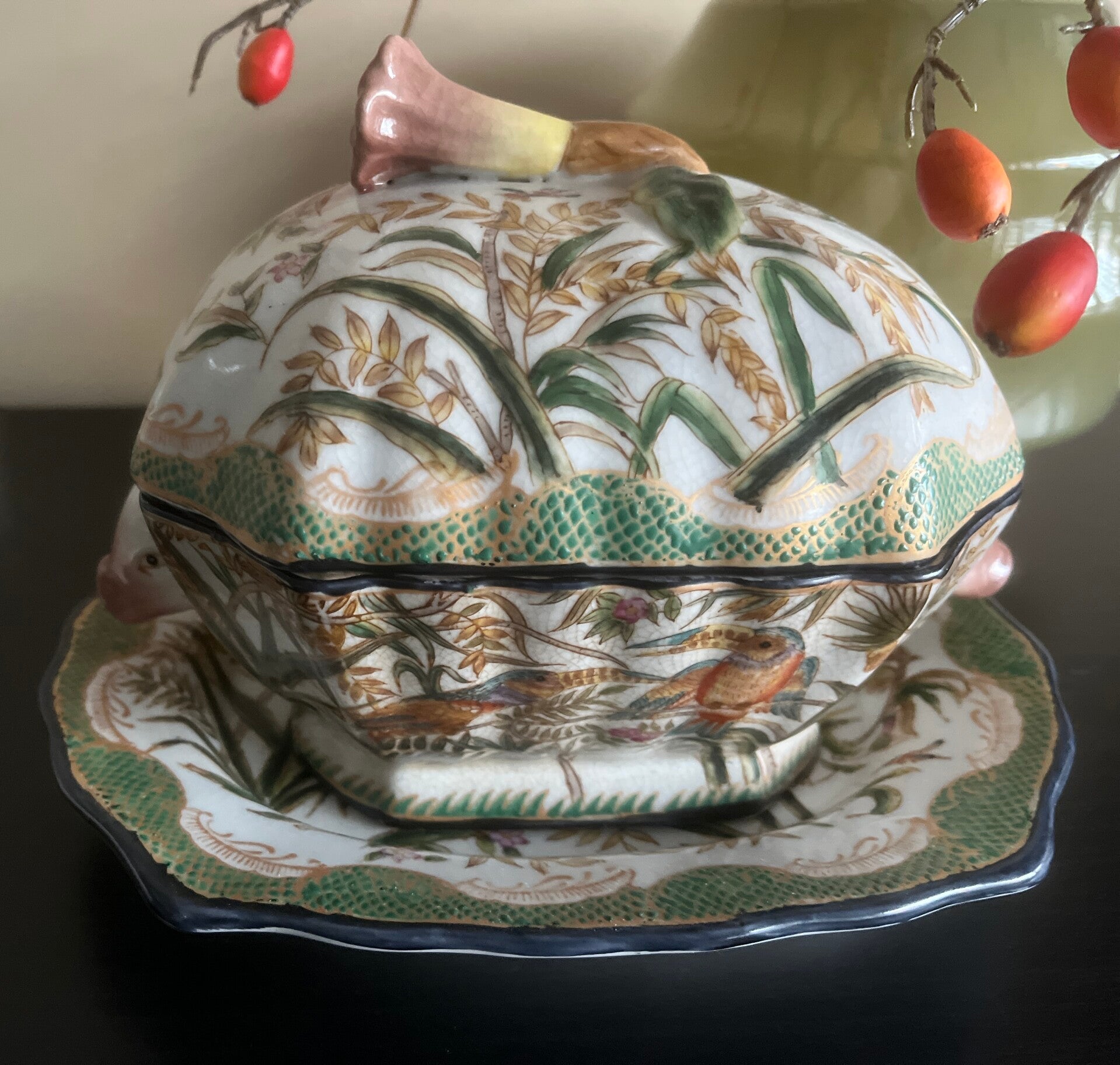 Deze terrine met een prachtig Botanisch patroon staat op een losse, ook volledig beschilderde schotel. De Pot is voorzien van bijzondere details zoals de varkenskopjes aan de zijkanten en de bloem bovenop.