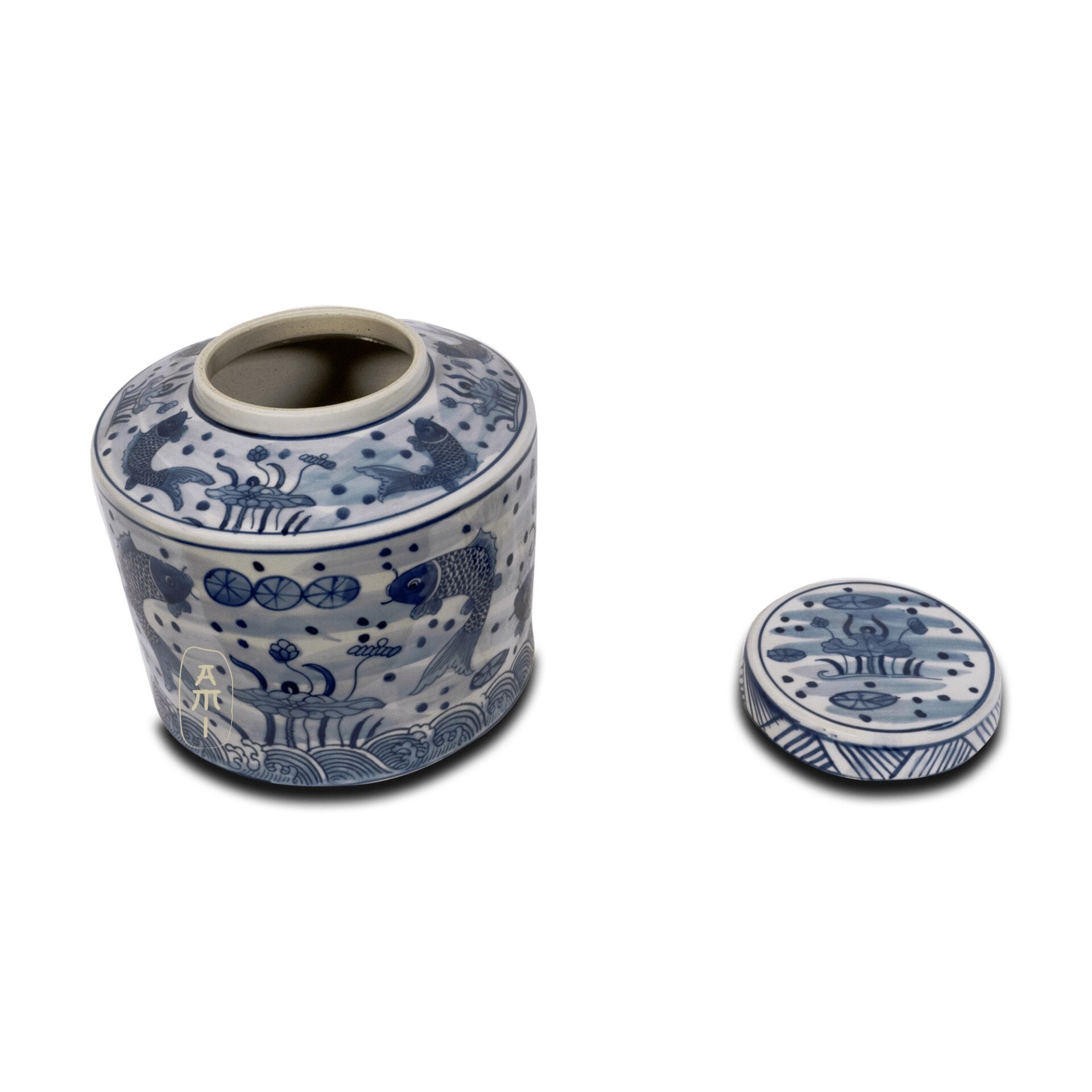 Handgemaakt op traditionele wijze. Ronde keramische pot beschilderd met Blauw vis ontwerp. De vissen symboliseren de harmonie van het huwelijk en vruchtbaarheid.